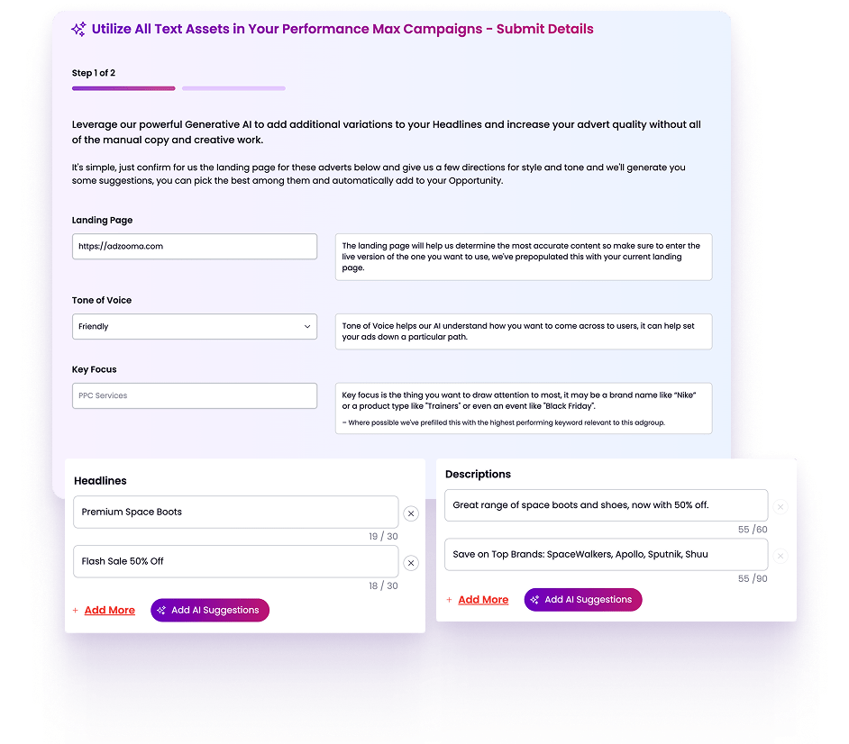 Adzooma’s AI strengthens your Performance Max and Search Ads with smarter, faster ad copy suggestions – while keeping you in full control.