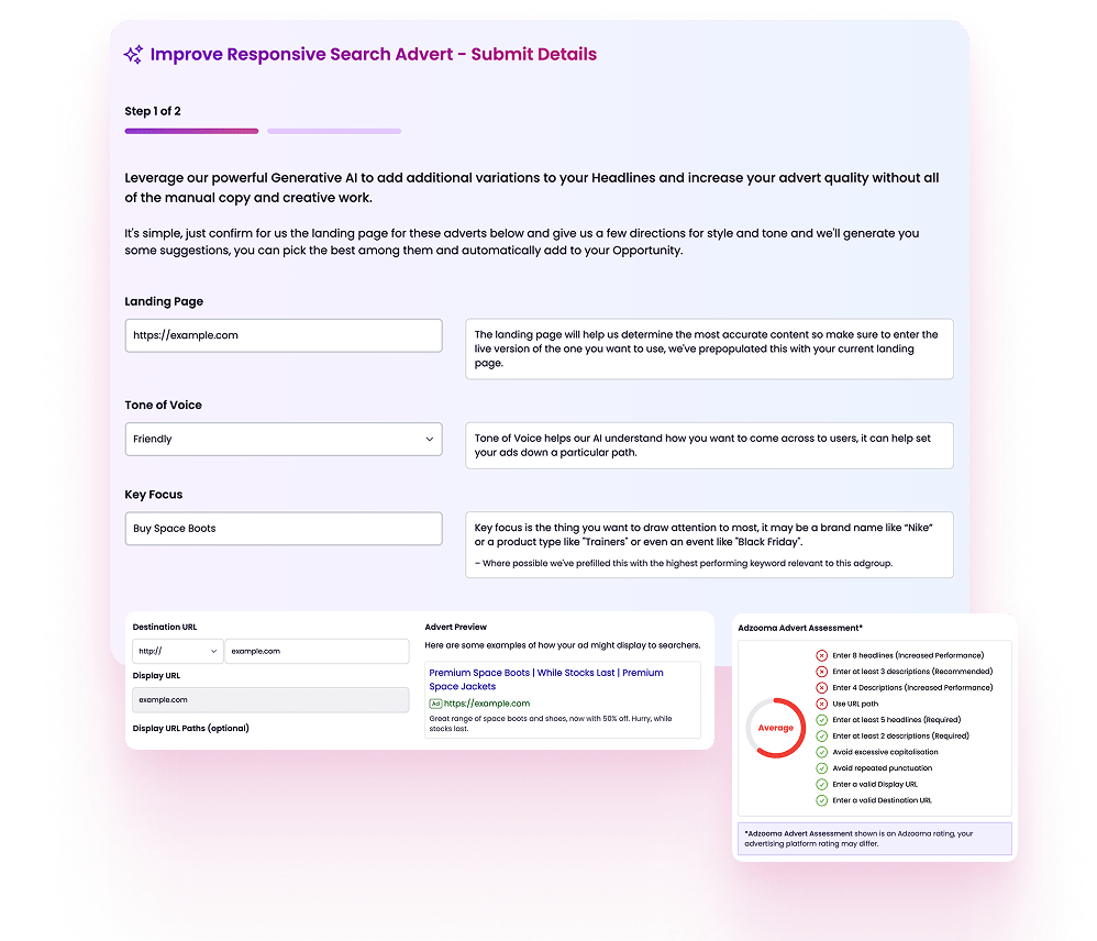 You’ll be asked for your landing page, campaign focus (such as product, service, or offer), and tone of voice so that the suggestions fit your brand.