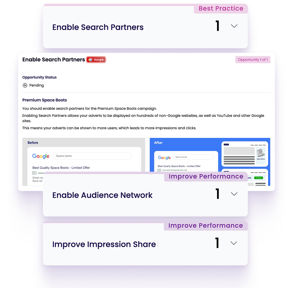 That’s fine. Adzooma lets you apply opportunities campaign by campaign, so you stay in control of where and how expansion is activated.