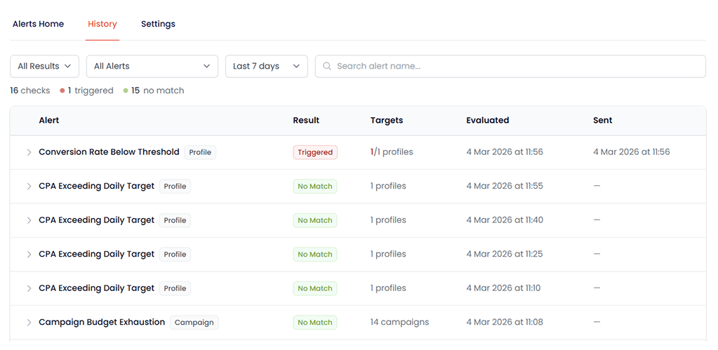 For advertisers who require more control, custom alerts allow users to define their own thresholds, combine conditions using logical rules, and align monitoring with internal KPIs or client SLAs.