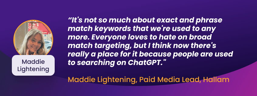 As AI continues to shape how people search, Maddie Lightening, Paid Media Lead at Hallam, says PPCers need to evolve alongside these changes to keep campaigns performing. “We’re right on the brink of a complete different way of users searching,” explained Maddie. “Working in Google Ads quite a lot, we have traditionally seen people searching keyword themes, so one or two words going straight to their ad, straight through to the landing page.