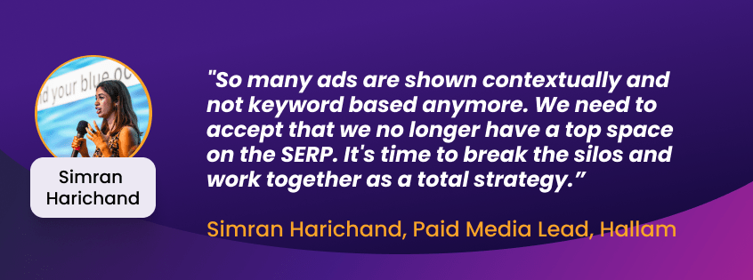 According to Simran Harichand, Paid Media Lead at Hallam, PPC pros may have been able to operate independently in the past, but succeeding today means working hand-in-hand with teams across the company. “I think for people to stay competitive and to still work as hard, they’re going to have to stop working in a silo and work alongside SEO, Organic PR, because that is the route to success now,” she explained.