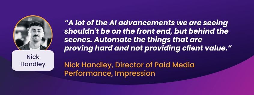 AI is playing a bigger role than ever in PPC optimization, but Nick Handley, Director of Paid Media Performance at Impression Digital, says it should be used more behind the scenes as well as front and centre. “There’s a lot of AI advancement at the moment in the industry, but I think testing tools and actually arming people with their own copilot is probably one of the biggest things that you can do,” he advises. “I think a lot of the, AI advancements we are seeing shouldn’t be on the front end, but behind the scenes.