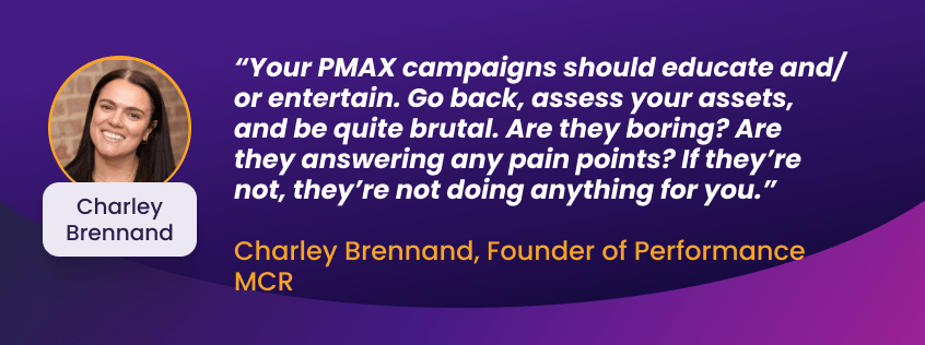 “My bit of advice for a really successful Performance Max campaign is, your content should be looking to educate and/or entertain”, she explained. “There is nothing worse than when you’re googling something and all of the shopping results are just exactly the same. And that’s what we’re getting hit with, is everybody’s following the same structure. So it is more easy than ever to stand out because all you’ve got to do is have slightly better copy or slightly better assets that you’re plugging in.