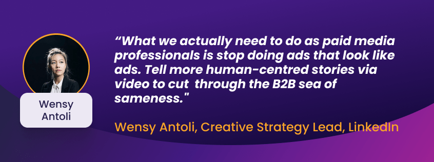 If you work in the B2B space, it can be all too easy to get lost and forget that at the end of the day, you’re selling to humans. Wensy Antoli, Creative Strategy Lead at LinkedIn says you need to make sure your ads resonate with them. “It’s all about telling human centred stories that are authentic, that the audience can relate to,” Wensy explained. “That helps to cut through all the B2B sea of sameness.