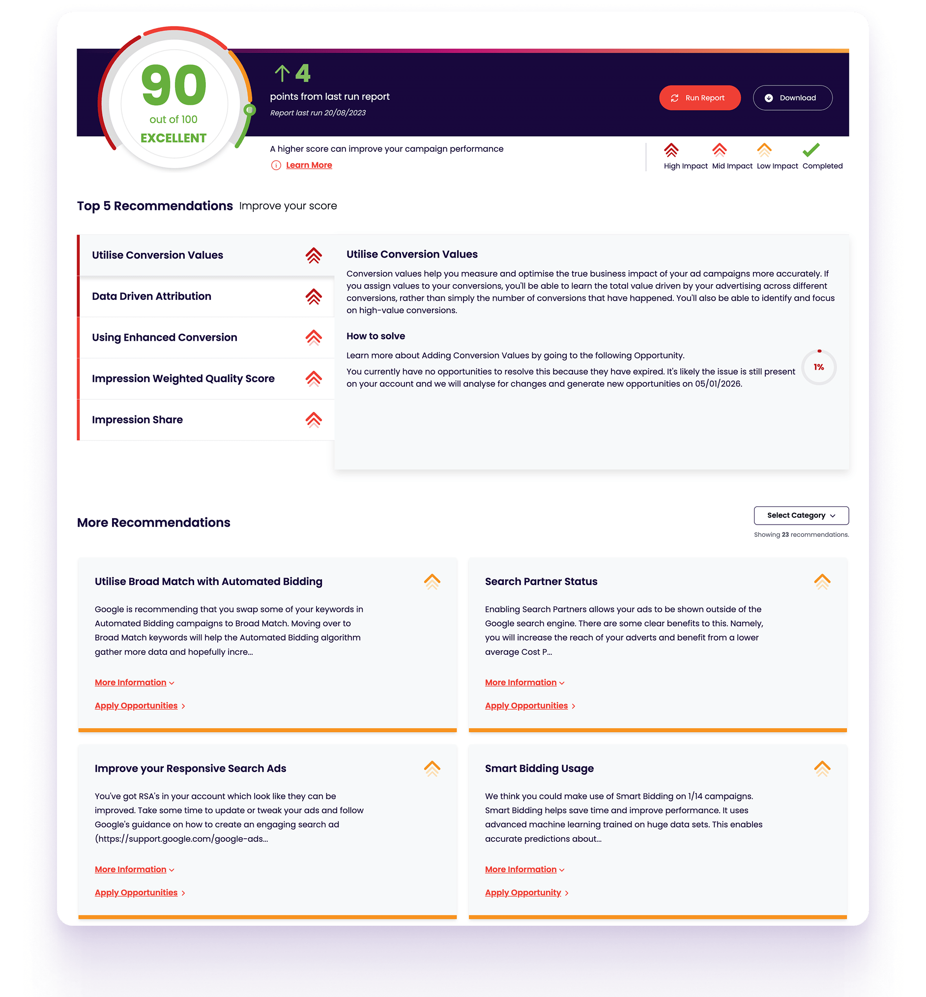 Adzooma complements existing workflows by double-checking for missed opportunities, wasted spend, or structural errors – keeping accounts healthy and clients satisfied.