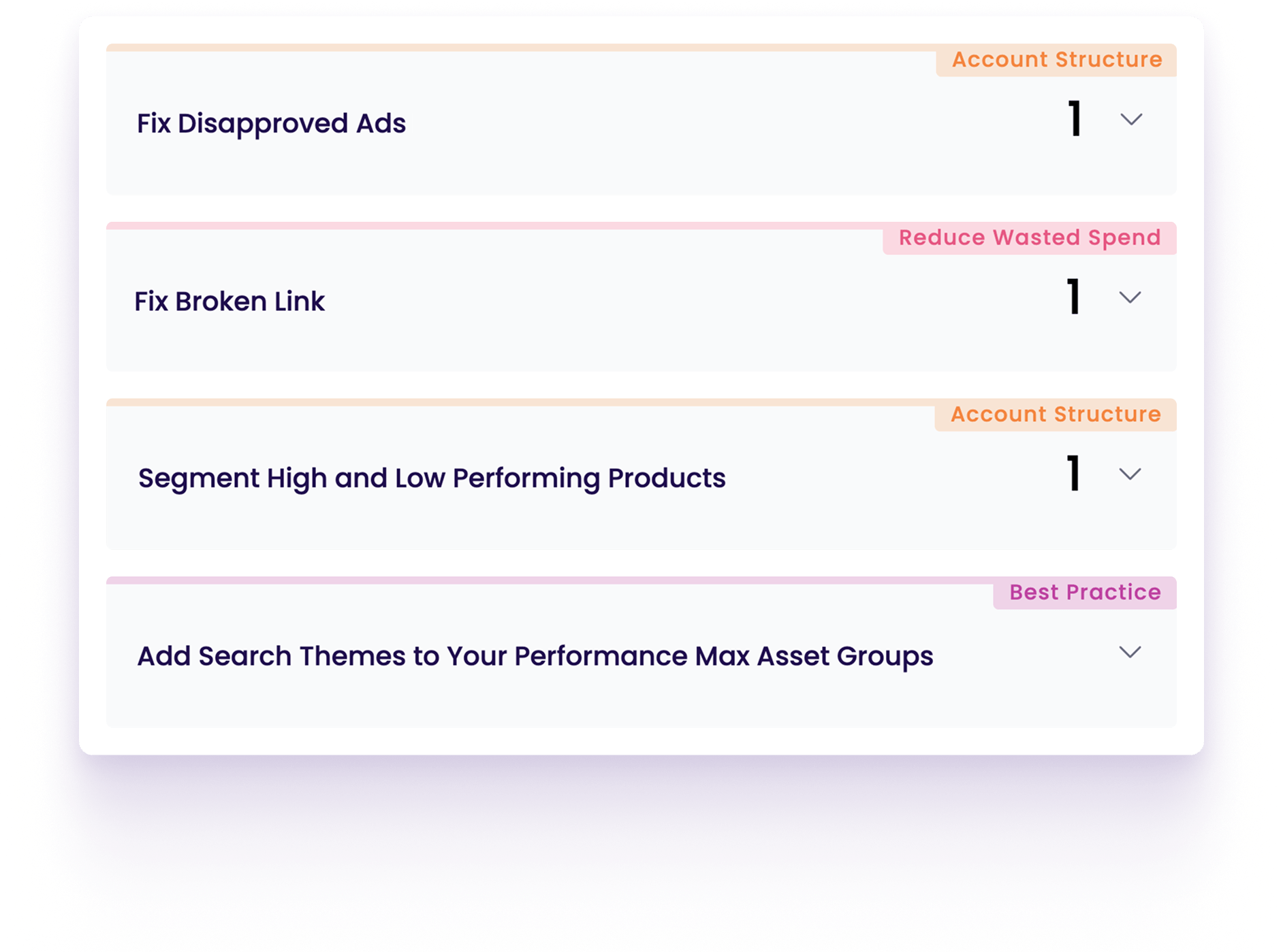 Adzooma audits your accounts daily to flag things like feed issues, missing assets, and budget pacing gaps. It also surfaces ROAS-focused opportunities in Shopping and Performance Max campaigns.