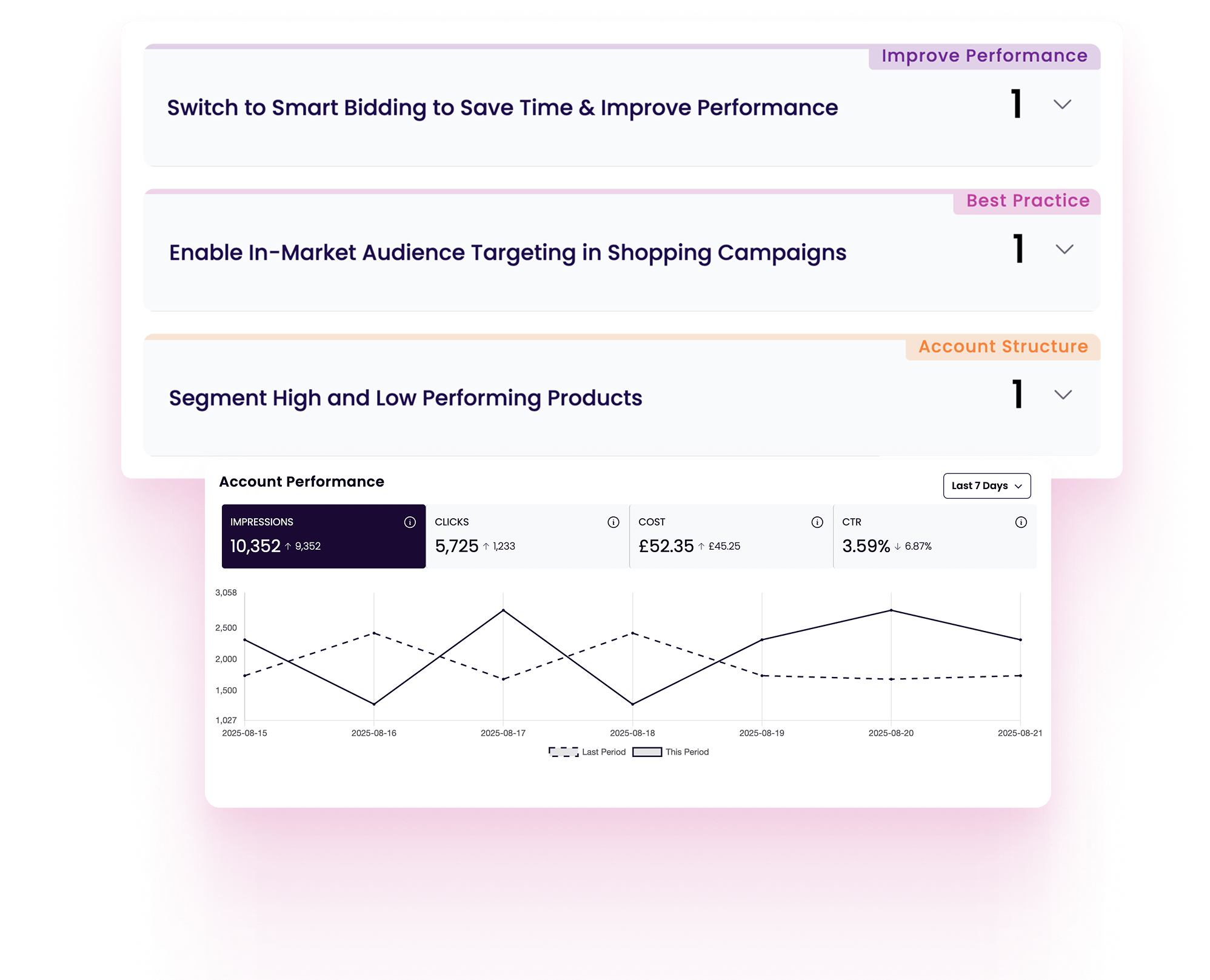 Adzooma audits your accounts daily to flag things like feed issues, missing assets, and budget pacing gaps. It also surfaces ROAS-focused opportunities in Shopping and Performance Max campaigns.