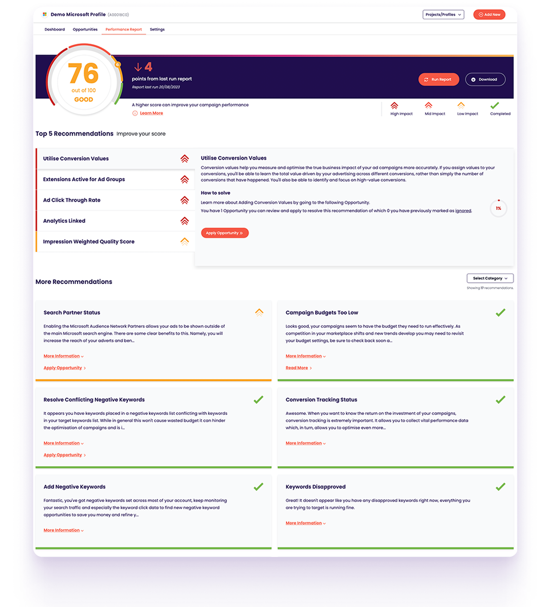 It’s an ongoing audit that scores your Microsoft Advertising account and provides prioritised recommendations to improve efficiency and ROI.