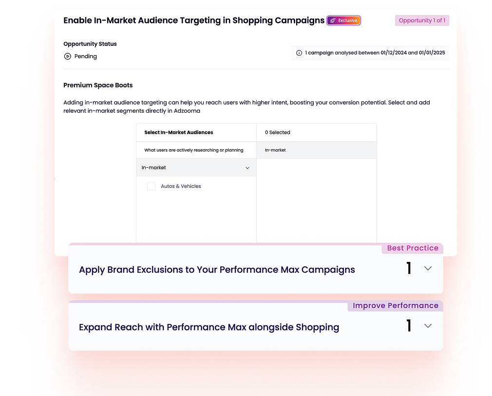 Adzooma analyses product feed quality, missing attributes, budget gaps, negative keyword opportunities, audience signals, UET tracking, and remarketing setup. These checks ensure your campaigns are compliant, visible, and profitable.